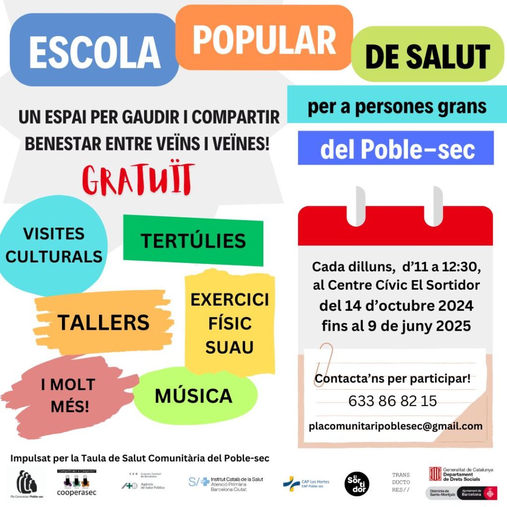 Empezamos conversando con tres invitadas de la Escola Popular de Salut per a persones grans del Poble Sec, una iniciativa que busca que vecinas del barrio puedan conocerse y disfrutar realizando diferentes actividades. Nos visitaron Bárbara -psicóloga y referente de bienestar emocional del CAP Les hortes-, y Carmen y Conchita -dos participantes de la Escola Popular de Salut- que nos cuentan su experiencia.